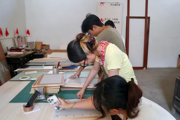 裝裱環節考驗的是耐心和細致。起初,隊員小吳信心滿滿地操作裁刀,卻發現刀刃根本不聽使喚,裁出的材料邊緣歪斜。潘老師并沒有直接批評,而是拍拍他的肩,幽默地說:“這裁刀也認生呢,得多陪陪它才行。”隨后親自示范如何發力、如何控刀,告訴大家:“手工藝急不得,心靜了,手才穩。”隊員們慢慢沉淀下來,從裁紙到托底,從組裝到密封,一步步細致操作,在反復實踐中體驗何謂“工匠精神”。
