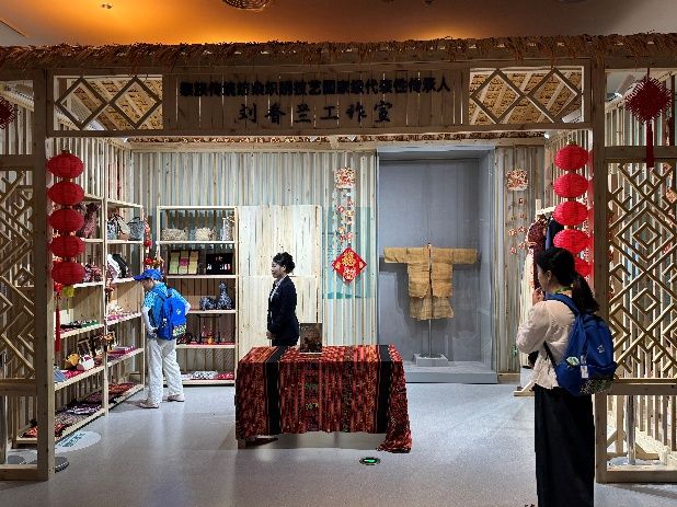 下午,團(tuán)隊(duì)聯(lián)合地方講解員,為參觀者導(dǎo)覽非遺展品,并走進(jìn)黎族傳統(tǒng)紡染織繡技藝國家級代表性傳承人劉春蘭工作室,在蠟刀繪圖區(qū),參觀者親手體驗(yàn)蠟刀繪圖、藍(lán)靛浸染的全流程,青少年專注勾勒船型屋輪廓,藍(lán)靛浸染池旁,志愿者演示“七浸七曬”古法。當(dāng)陽光穿透晾曬的布匹,藍(lán)白交織的紋路如南海波濤擁抱五指山巒,當(dāng)孩子們的作品在陽光下晾曬時,藍(lán)白交織的布匹仿佛承載著山海對話。