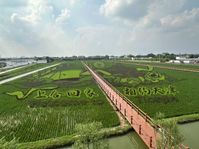 走進小站稻會館種植核心區,600余畝的稻田綠意盎然,微風拂過,稻葉沙沙作響,散發著清新的稻香。而在這片稻田之中,一幅由不同品種水稻“繪制”而成的上合峰會主題稻田畫格外引人注目。畫面中,上合組織的標志與天津的代表性建筑相互映襯,還有象征著和平與友誼的圖案,通過巧妙的稻田布局,栩栩如生地展現在眼前。