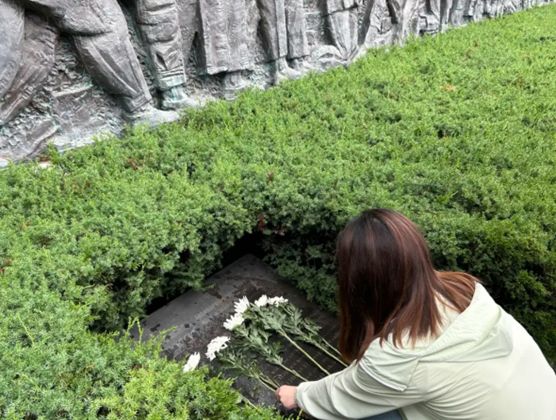 圖為團(tuán)隊(duì)成員向南京大屠殺遇難同胞獻(xiàn)花,朵朵芬芳承載著對逝去生命的深切緬懷。
