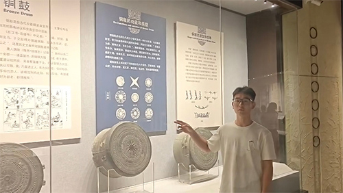 尋跡--四城行走觸摸文化脈搏 7月11日起,團隊成員先后深入廣西、貴州、重慶、江蘇、江西等地開展材料的收集工作,他們用視頻和圖片的形式記錄下當?shù)鬲毺氐拿褡逦幕。在廣西,隊員走進當?shù)夭┪镳^去探尋民族藝術瑰寶的銅鼓和壯錦。團隊成員光電2402班李昭科在柳州博物館用視頻記錄著壯錦的絢麗多彩和銅鼓文化的厚重底蘊,他在視頻中講解到:“博物館展示柜中古老的銅鼓,形制渾厚,仿佛傳遞著先民對力量與豐收的祈愿。經(jīng)緯交織壯錦,也是民族智慧與藝術精神的生動體現(xiàn)。”在貴州,隊員走進貴州省民族博物館,去探尋閃耀在銀飾與歌聲中的苗侗民族文化。團隊成員用視頻記錄了精湛的銀飾鍛造技藝,以及記錄回蕩在山谷間的原生態(tài)民族歌曲,飽含著對自然的敬畏與生活的熱愛。團隊成員大數(shù)據(jù)2402班王粵旭在為小朋友拍攝的視頻中講解到:“蝴蝶媽媽、牛角等圖案承載著苗族歷史記憶,銀飾叮當聲既是裝飾,也是民族身份的象征。”在重慶,團隊成員走進重慶火鍋博物館,用視頻記錄下了煙火與傳統(tǒng)技藝中彰顯獨特魅力的飲食文化----重慶火鍋。與此同時,在江蘇南京的小分隊,重點考察了六朝古都多民族交融的歷史印記和現(xiàn)代發(fā)展。除此之外,廣東中山、江蘇蘇州、江蘇鹽城等地的團隊成員也紛紛用影像記錄下了當?shù)氐莫毺氐拿褡逦幕,為交流分享提供了詳實的材料。這個夏天,不同的城市,不同的文化體驗,卻共同訴說著中華民族多元一體的動人故事。