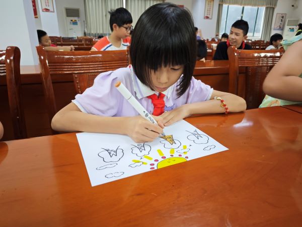 在結束環保宣傳手冊的學習后,隊員們向在座的60位小朋友發起繪畫邀請,并一一分發繪畫工具與紙張。隊員們鼓勵著小朋友們用畫筆描繪自己心目中的綠色家園。小朋友們借著五彩斑斕的畫筆激情發揮,讓自己的想象力騰躍于一張張畫紙上:是春天隨風搖曳的柳樹、是夏日艷陽下綠油油的小山、是草坪上可愛迷人的小花貓。一幅幅對大自然充滿愛意的畫作儼然化作一道彩虹橋,托起了共建綠色家園的新希望。