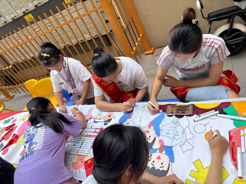 活動當天上午,伴隨著《我和我的祖國》悠揚的旋律,小朋友們在家長的陪伴下陸續來到現場,臉上洋溢著期待的笑容。4 名志愿者分工協作,有的通過生動有趣的小故事,向孩子們講述國慶節的由來以及祖國近年來的發展成就;有的則協助老師整理繪畫工具,為后續創作做好準備。當提到 “神舟飛船”“港珠澳大橋” 等國家重大工程時,孩子們紛紛發出驚嘆,眼中閃爍著自豪的光芒。隨后,繪畫環節正式開始。老師提前準備好的 6 米長畫布被平鋪在活動場地中央,16 位小朋友在志愿者的一對一引導下,有序地選擇自己喜歡的繪畫區域和顏料。有的小朋友認真地勾勒著天安門的輪廓,一筆一劃都格外專注;有的小朋友則用鮮艷的紅色和黃色,繪制出飄揚的五星紅旗,還在旁邊寫下 “我愛中國” 四個稚嫩的大字;還有的小朋友發揮想象力,將航天火箭與長城結合,畫出 “祖國科技騰飛” 的美好場景。志愿者們不時在孩子們身邊停留,耐心地指導他們調色、下筆,還主動幫年紀較小的孩子蘸取顏料,緊湊而溫馨的互動中,現場始終充滿歡聲笑語。