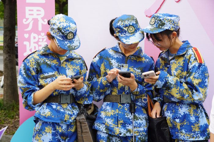 圖為志愿者與學(xué)生在打卡框處合影。陳天樂 供