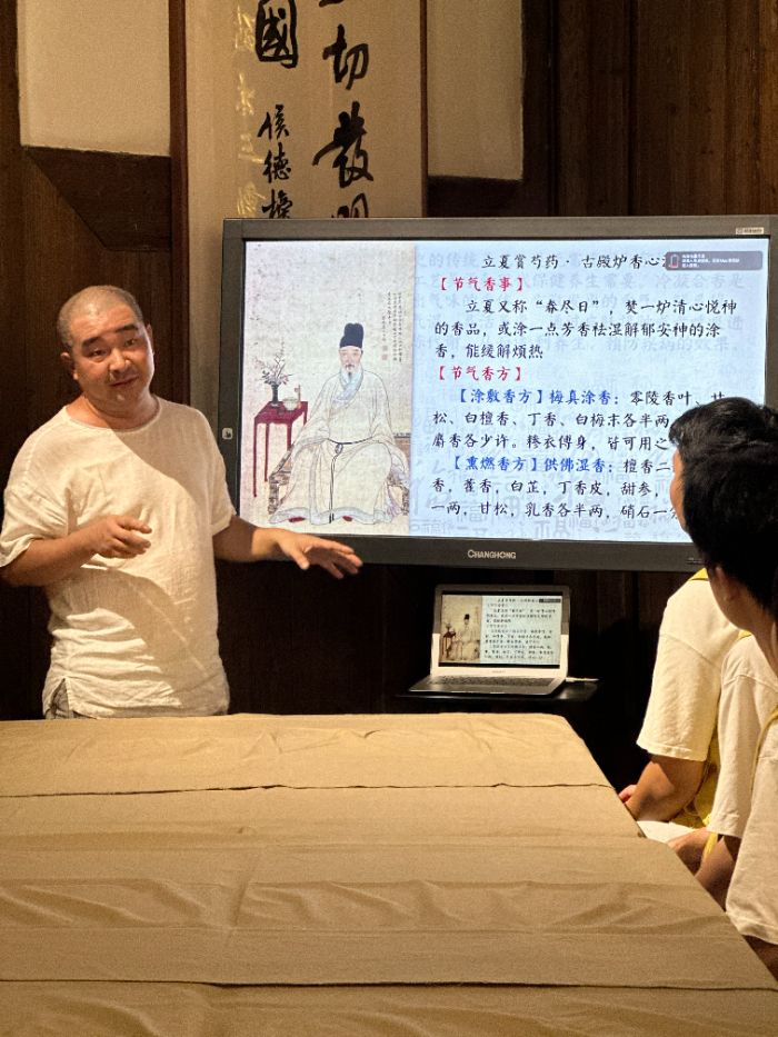 走進陳衛(wèi)平大師的工作室,古樸的香案、典雅的香具、層疊的木制香盒,共同營造出一方沉靜的天地。陳大師向同學們介紹冷凝合香的由來——它源于古代宮廷御香制作技藝,講究選料純凈與溫度控制,是福州地區(qū)珍貴的非物質文化遺產(chǎn)之一。大師細致地講述了冷凝工藝的核心:如何在恒溫條件下讓香氣凝聚成形,讓天然香料的芬芳得以長久留存。