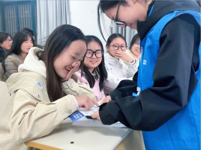 猜謎環(huán)節(jié)落幕,特制明信片成為青年心聲的載體。“干驚天動地事,做隱姓埋名人”“如果祖國需要,我的名字也愿被代號替換”,一句句滾燙的誓言,寫滿了新時代青年對核工業(yè)精神的傳承與擔當。同學們手持明信片依次登臺,志愿者落下的“星跡”印章——紅五星環(huán)繞原子核,不僅是儀式的印記,更象征著個人微光融入強國星河的信念。當“兩彈一星”定制徽章別在胸前,志愿者那句“這是一枚可以戴去未來的勛章”,道出了青年與核工業(yè)事業(yè)的精神聯(lián)結(jié)。