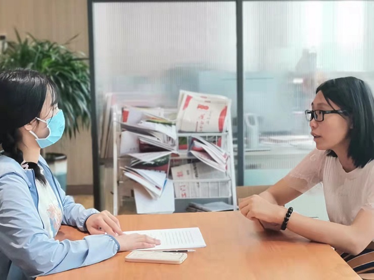 圖為調研組隊員在采訪文化館工作人員胡小姐。
