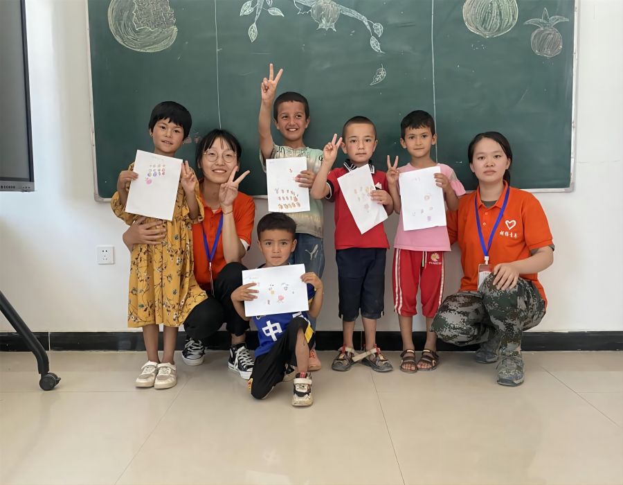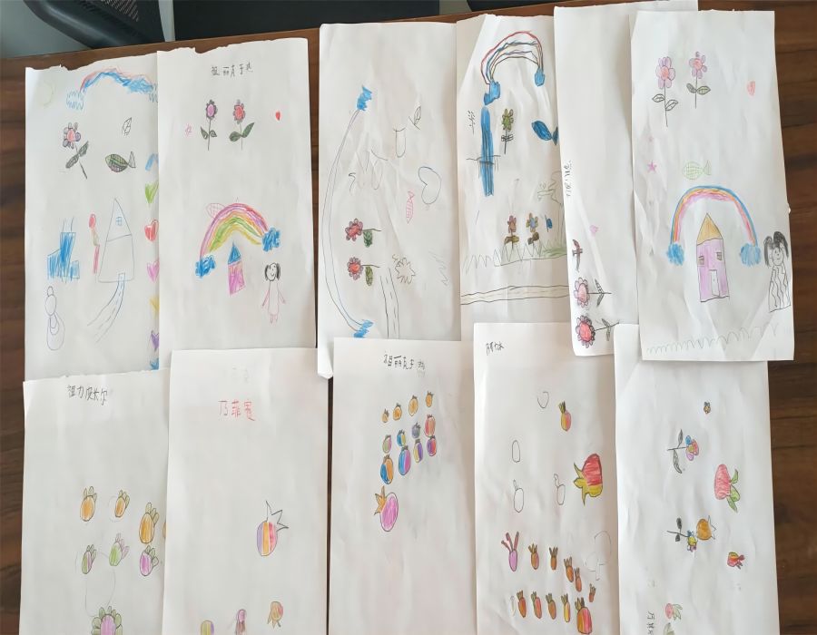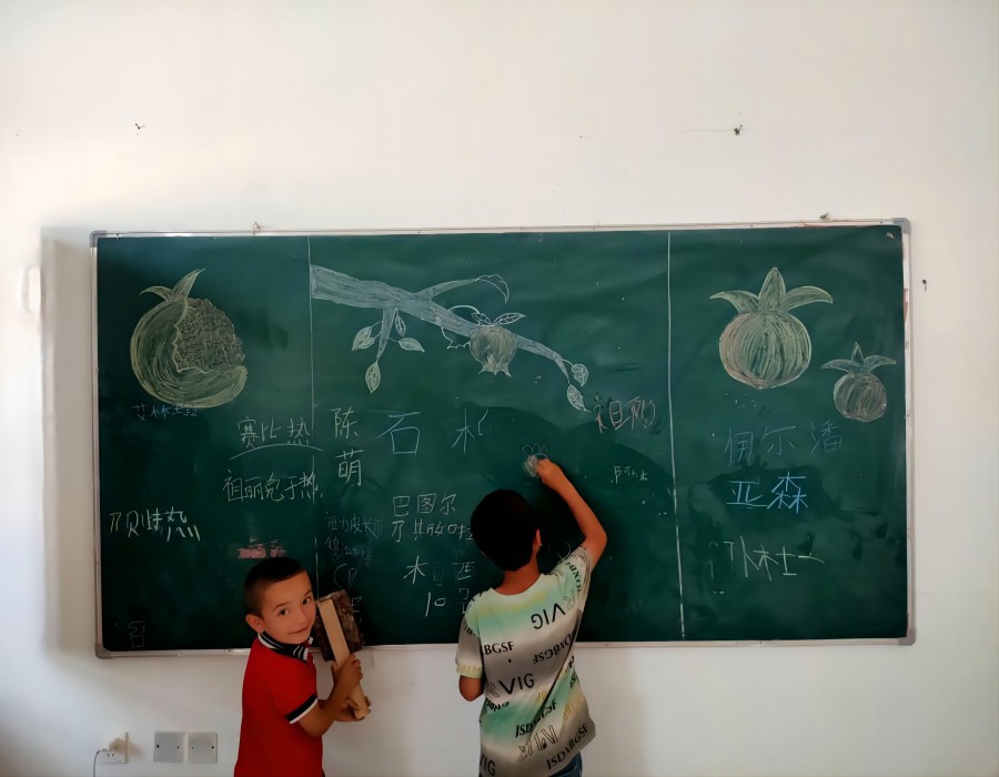 在活動(dòng)結(jié)束后,團(tuán)隊(duì)成員與繪畫的小朋友們進(jìn)行了合影留念,每個(gè)小朋友的臉上都洋溢著開心的笑容。繪畫的小朋友祖力克于熱說(shuō)“老師,我畫的石榴里面有紅色、黃色和藍(lán)色等等其他好多彩色的顏色,石榴里面是彩虹!”對(duì)呀,小朋友們繪出的石榴有著各種各樣的顏色,是孩子們心里最美麗的顏色,他們已然將民族團(tuán)結(jié)的意識(shí)融入在了繪畫之中。