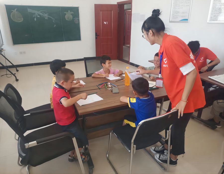 圖為團(tuán)隊(duì)成員解答小朋友的繪畫問(wèn)題