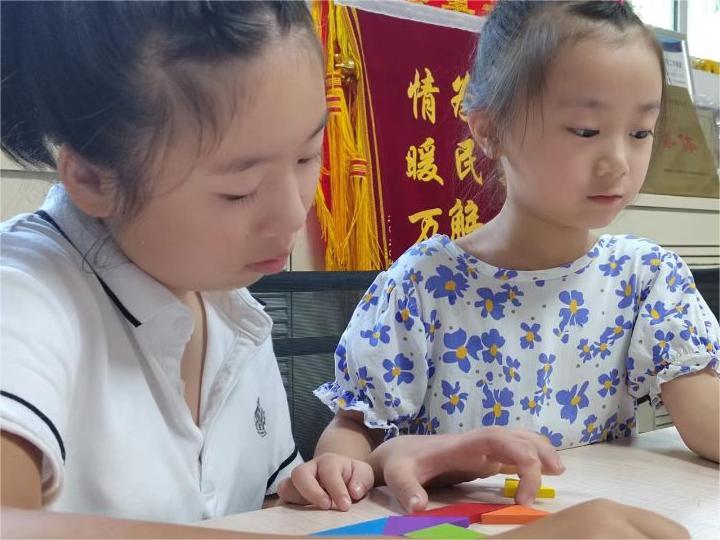 圖為小朋友們合作完成“七巧板”拼圖。多彩大學(xué)生網(wǎng)通訊員 李彤 攝