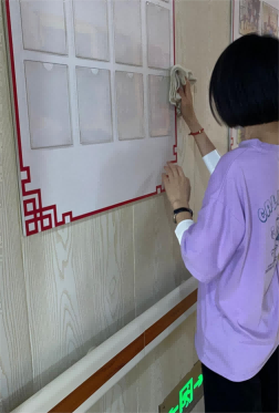 打掃衛生,盡心盡力老人房間的衛生清潔,護理員工們基本上都已打掃干凈,收拾妥當。經過護理員工的指導,隊員們用抹布擦拭大廳和走道的物品,為敬老院的老人提供力所能及的幫助與服務。