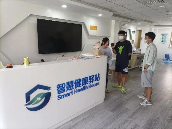 (圖為工作人員帶領小分隊參觀智慧健康驛站)