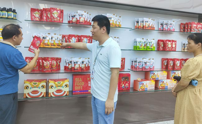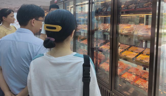馮治國先生首先為我們介紹恒興集團的水產(chǎn)特色零食,水產(chǎn)品營養(yǎng)價值豐富,兼具健康與美味,深受人們喜愛,除了目前市面上暢銷的麻辣口味的水產(chǎn)類零食,恒興集團也在嘗試鹵味等新風味的研發(fā)。接著我們又參觀了恒興集團的水產(chǎn)預制菜,不同的冰柜區(qū)分出即烹預制菜與即熱預制菜。即烹預制菜如酸菜魚、剁椒魚頭等,它們的特點就是口味更還原,消費者的參與感更高,而即熱預制菜則只需微波加熱或者明火加熱,其口感、外觀不如即烹預制菜如,但更為方便、快捷。對于不同地區(qū)的口味、人群需求,恒興集團也有針對性研發(fā),如江浙地區(qū)的風味熏魚、老醋鱸魚塊,廣東地區(qū)的蒜蓉蝦丸、蒜蓉生蠔、一品海鮮堡等,分量方面,有針對于上班族一人食,也有家庭版大份量。預制菜除了供應國內(nèi)市場外,還將會出口至美國、加拿大等國,致力將最優(yōu)秀的原汁原味的中國美食帶向全世界,同時,可以一解海外華人的思鄉(xiāng)之情。