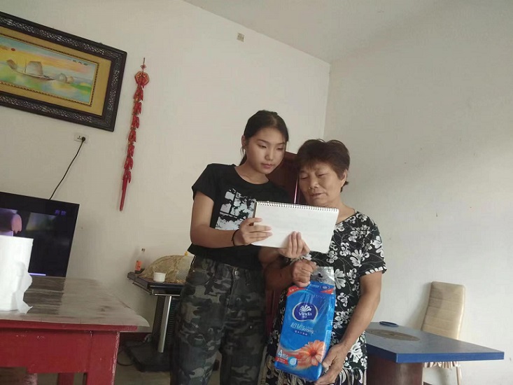 圖為小組成員深入住戶,為農村老人解讀普通話,并邀請老人誦讀紅色故事。
