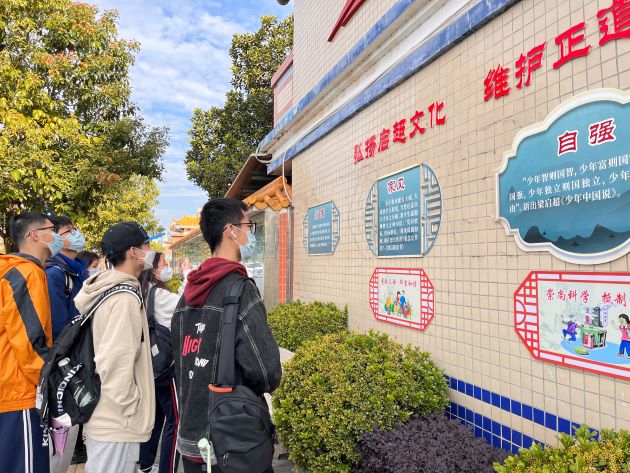 實踐團成員閱讀茶坑村“啟超文化”(上圖)