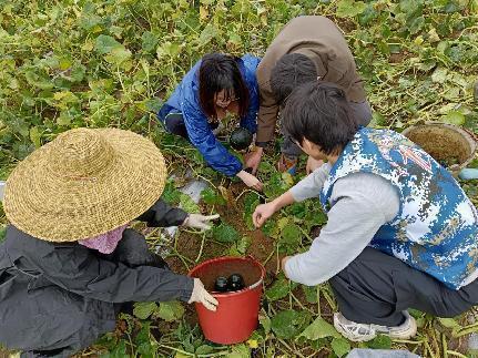 “軍創(chuàng)優(yōu)品”團隊成員與村民一起采摘貝貝南瓜(來源:受訪者供圖)