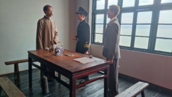 來到潮江樓,映入眼簾的便是王荷波烈士的雕塑以及墻上鮮艷的黃字“貪生怕死別當共產黨,貪圖享受也別當共產黨”,敬仰之情油然而生。在講解員的帶領下,實踐隊成員們認真觀摩“千錘百煉”“工運領袖”“潮涌馬江”“紀檢先驅”“碧血丹心”“紅色家風”和“不忘初心 砥礪前行”等7個板塊,一同走近王荷波同志,回顧他短暫但光輝的一生。其中,講解員著重介紹了發生于潮江樓的馬江會議,這是一場由王荷波同志主持召開并為北伐戰爭作出卓越貢獻的會議,由此隊員們深刻認識到王荷波同志對黨忠貞不渝的革命品格,鞠躬盡瘁、英勇無畏的革命精神,清正廉潔、品重柱石的崇高境界。