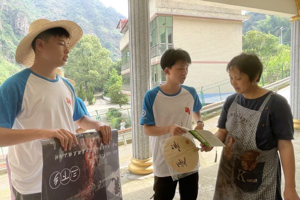 入駐山陽村后,志愿者們分為三個小隊,各自有著不同的任務。其中一隊由老師帶領,將由志愿者提前創作好的三下鄉主題扇子送給當地村委,并邀請他們一同參加創作;二隊分為四個小組,深入山陽村對“扇送清涼”活動以及后續的支教、調研等一系列活動進行宣傳,并且向當地的村民發出扇面創作的邀請;三隊負責在村民服務中心開展擺點活動,配合當地村民、引導小朋友通過涂鴉、寫字、畫畫等方式一起放飛思想,創作扇面。