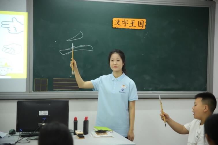 中國書法具有悠久的歷史、廣泛的群眾基礎和極高的美學價值。2011年8月教育部下發(fā)文件要求在義務教育階段語文課程中,按照課程標準要求開展書法教育。為響應國家對重視書法教育的強烈號召,7月4日上午9:50,重慶師范大學初等教育學院“青春飛揚•興夢夏鄉(xiāng)”志愿服務隊志愿者許琳在徐家鎮(zhèn)中心小學開展了一堂軟筆書法課。