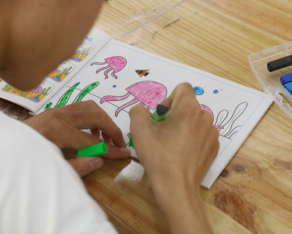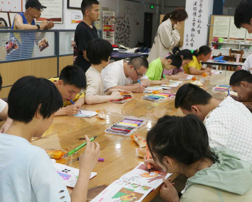短暫休息過后,大家進入了畫畫訓練的環(huán)節(jié)。小伙伴們端正地坐在位子上,看著前方摞起的涂畫書,眼里盡是期待。負責人為每個人選出了喜愛的圖畫,小隊成員則為他們介紹了圖畫上的事物。這是一場訓練,更是一場比賽,每位小伙伴都想涂出最美麗的圖案。