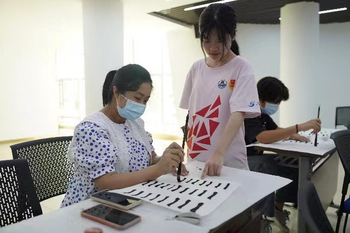 “筆沒豎起來”“奶奶穩住,筆畫慢慢拉過去”“寶貝,你已經進步啦!”“紅帆”開展的第一課得到了親子家庭、新江社區干部、高齡奶奶等各年齡段居民的大力支持,課后小老師們也得到了同學們的肯定。