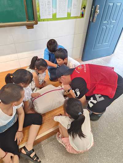 多彩大學(xué)生網(wǎng)7月7日電(通訊員 劉嘉琪 劉寒霜 覃焱韜 劉杰夫 耿恒)為了加強(qiáng)青少年兒童的急救知識(shí)儲(chǔ)備,提高青少年兒童緊急避險(xiǎn)意識(shí)和應(yīng)急救護(hù)能力。7月7日,湖北醫(yī)藥學(xué)院“七彩社區(qū)之青春護(hù)夢(mèng)”暑期社會(huì)實(shí)踐隊(duì)前往十堰市鴛鴦中心學(xué)校開(kāi)展急救知識(shí)進(jìn)校園活動(dòng)。實(shí)踐隊(duì)成員通過(guò)理論講解、示范操作與實(shí)操訓(xùn)練、幫教互動(dòng)等方式向小朋友們傳授了心肺復(fù)蘇術(shù)、海姆立克急救法和包扎等應(yīng)急救護(hù)知識(shí),并讓小朋友們輪流操作。在社會(huì)實(shí)踐隊(duì)隊(duì)員的指導(dǎo)下,他們掌握了正確急救方法,熟練了關(guān)鍵的救護(hù)流程,能夠沉著應(yīng)對(duì)緊急突發(fā)傷害事件中的意外。教學(xué)現(xiàn)場(chǎng)氣氛熱烈,互動(dòng)積極,收效明顯。