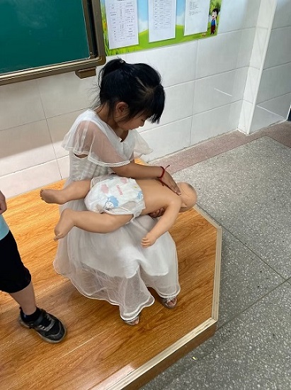 圖為社會(huì)實(shí)踐隊(duì)員指導(dǎo)孩子練習(xí)海姆立克急救法。多彩大學(xué)生網(wǎng) 通訊員 黃鉦雄 攝
