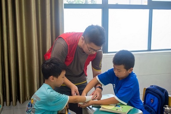 圖為社會(huì)實(shí)踐隊(duì)員指導(dǎo)孩子們練習(xí)包扎。多彩大學(xué)生網(wǎng) 通訊員 黃鉦雄 攝