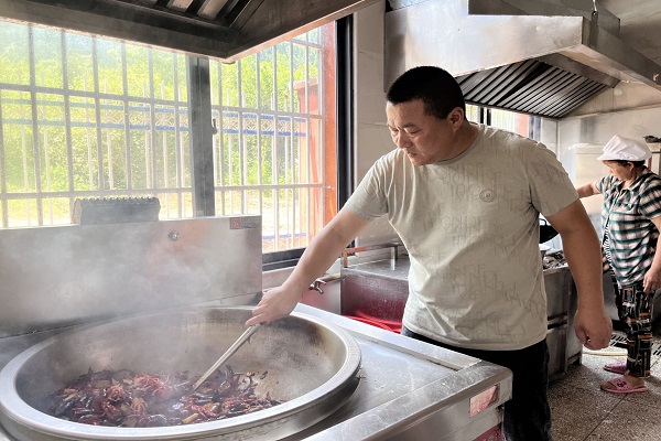 在支教團隊籌備教學工作的同時,當地人民也給予極大的物資支持。洞泉村村委書記程書記為支教團隊特意送來后勤物資,帶來豐富的食材并且親自下廚為支教活動做小龍蝦等當地美食。支教隊員們積極幫忙,主動參與清洗小龍蝦的任務。因天氣炎熱酷暑難耐,支教成員們趁著傍晚太陽落山的時間出校購買物資。由于學校周圍沒有較近的日用品商店,他們只能以小分隊的形式徒步走到距離學校較遠的商店購買生活物資。一路上,隊員和隊員之間相互照顧。每次外出,隊長何飛揚做出規定,外出時每隊一定要有兩名以上的男生同行,以保障出行安全。