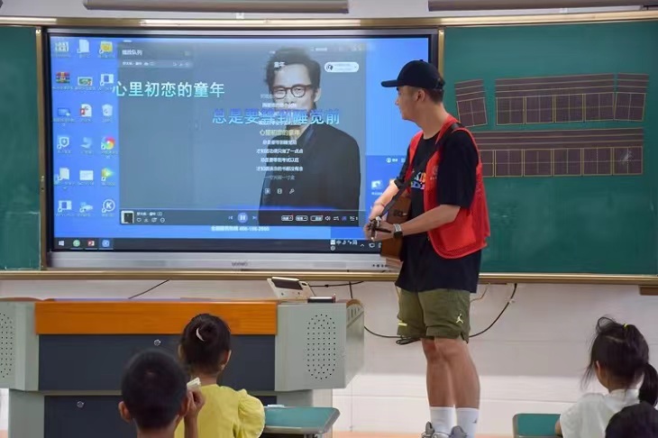 圖為社會實踐隊員教小朋友們唱歌。多彩大學生網 通訊員 袁子航 攝