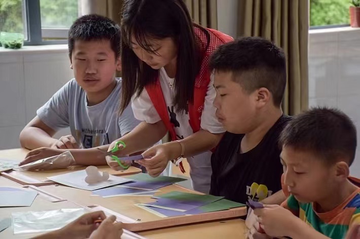 圖為社會實踐隊員和小朋友們一起制作手工。多彩大學生網 通訊員 袁子航 攝