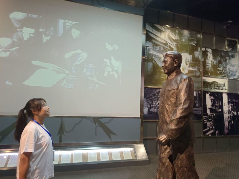 圖為團隊成員瞻仰中國汽車之父——饒斌的銅像,為饒斌先輩的英勇事跡欽佩不已。中國青年網通訊員 張忠玉 攝