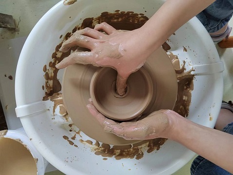 在拉坯的過程中遠離網絡世界的喧囂,在不斷滑動的觸覺中感受自然……這一刻躁動的內心逐漸歸于平靜,有時候快樂不需要多么復雜,簡簡單單也是真。仿佛有生命的泥團在靈巧雙手的撫摸下一邊旋轉,一邊長高,慢慢定型。從此一團沒有生氣的泥土被賦予了多彩的生命,它的故事從此刻開始譜寫。拉坯有一種神奇的魅力,妙在隨心所欲,妙在隨心變化,妙在隨心而靜。