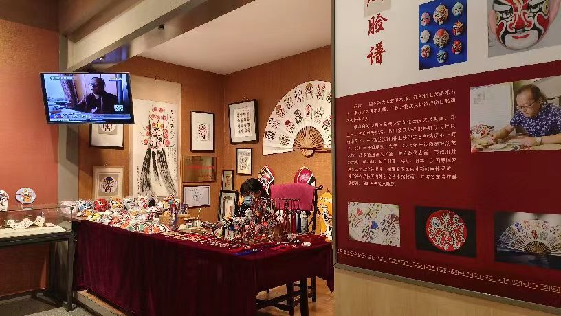 圖為南京博物院非遺館“南京京劇臉譜”展位及手藝人現場制作展示