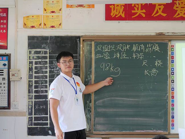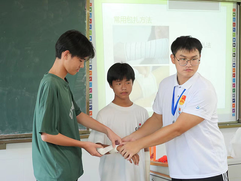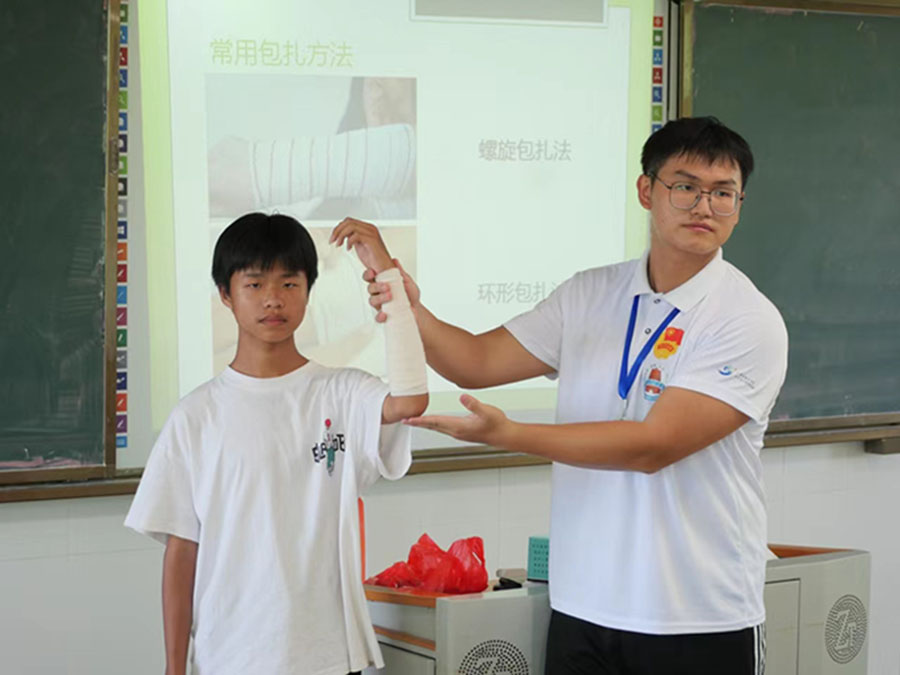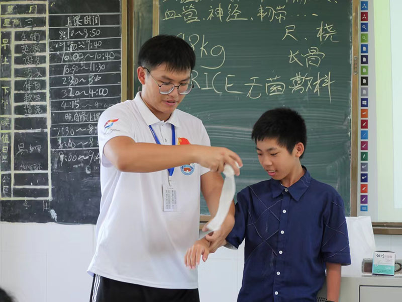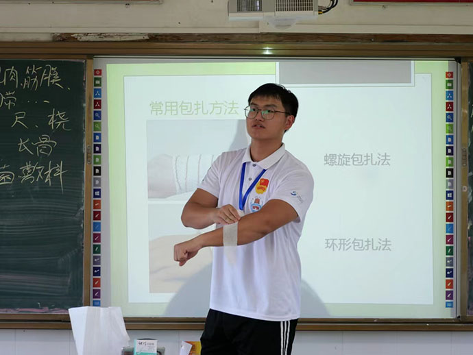 為全面貫徹黨的二十大精神,落實(shí)新形勢(shì)下健康工作方針,以提高人民健康水平為核心,以滿足人民群眾需求為目標(biāo),堅(jiān)持急救事業(yè)的公益性,提升學(xué)生急救能力,振興鄉(xiāng)村教育發(fā)展,引導(dǎo)學(xué)生樹(shù)立科學(xué)運(yùn)動(dòng)意識(shí),保障學(xué)生身體健康,嶺南師范學(xué)院“萌芽”社會(huì)實(shí)踐隊(duì)隊(duì)員周展藝于7月7日下午在吳川市塘綴鎮(zhèn)板橋的上杭中學(xué)開(kāi)展了“運(yùn)動(dòng)損傷與應(yīng)急包扎”主題教育課堂。