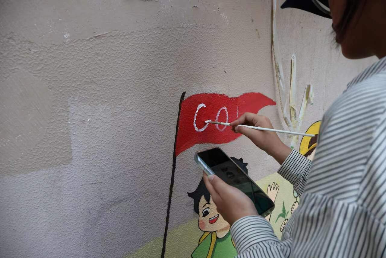 暑熱只是第一道坎,小藝鹿們頂著烈日作畫,水滴由懸掛在墻上的空調外機滴落下來,冷不伶仃,堅持不懈地干擾著墻根底下地作畫者。不僅如此,丙烯顏料未干時遇水則溶,精心調制的色彩剛上墻便被沖刷的,只剩三分淡色,色素隨著水滴在斑駁的墻壁上婉延而下,仿若兩行清淚帶著不甘。
