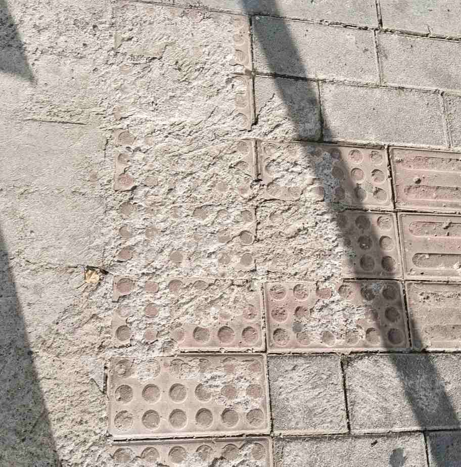 同時,實踐隊也對街道上的盲道進行了觀察與記錄。經觀察發現,目前盲道較為普及,幾乎所有道路上都已鋪設,但不少盲道卻仍然存在鋪設不連貫不規范、觸點被磨破、磚塊損毀的現象,一些盲道還出現有障礙物,甚至是莫名中斷的情況。同時,盲道被占用的情況仍然突出,大多數盲道都被路邊停放的車輛占用,在人流量較多的超市附近劃定的車輛停放范圍甚至與盲道間無空隙,且部分行人在行走時也會無意識的占用盲道。盲道的占用為殘疾人士的出行帶來了一定的困難,是殘疾人不愿意出行的一個重要原因。