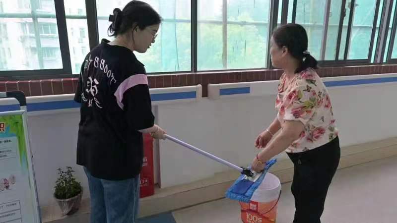 圖為隊員和工作人員共同打掃走廊 孫曙曙 攝