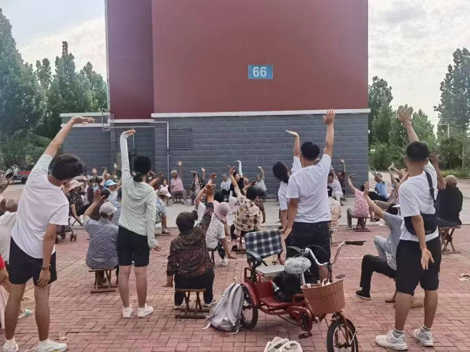 團(tuán)隊(duì)成員告別黃爺爺和奶奶,繼續(xù)進(jìn)行社區(qū)舒適物配置情況調(diào)研。在調(diào)研過(guò)程中,實(shí)踐團(tuán)見(jiàn)到大量社區(qū)居民們聚集在樓房一側(cè),實(shí)踐團(tuán)發(fā)現(xiàn)一位小姐姐帶領(lǐng)許多老人進(jìn)行身體鍛煉拉伸。在小姐姐的邀請(qǐng)下,隊(duì)員加入其中,與社區(qū)居民一同進(jìn)行鍛煉。