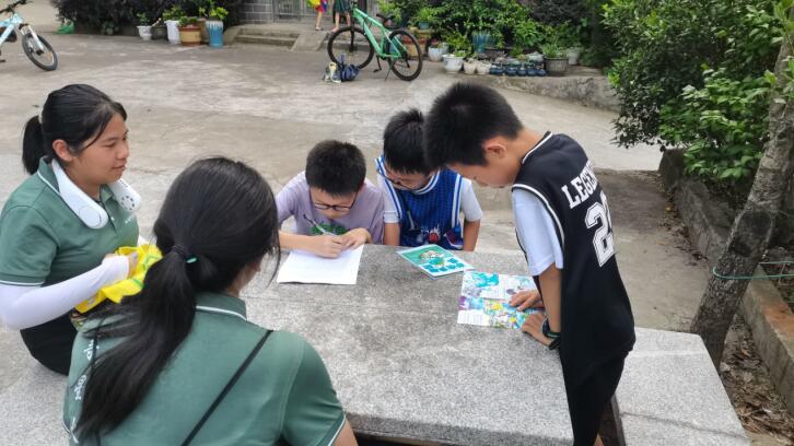 (圖為實踐隊員向孩子們發放環保手冊并進行知識科普)