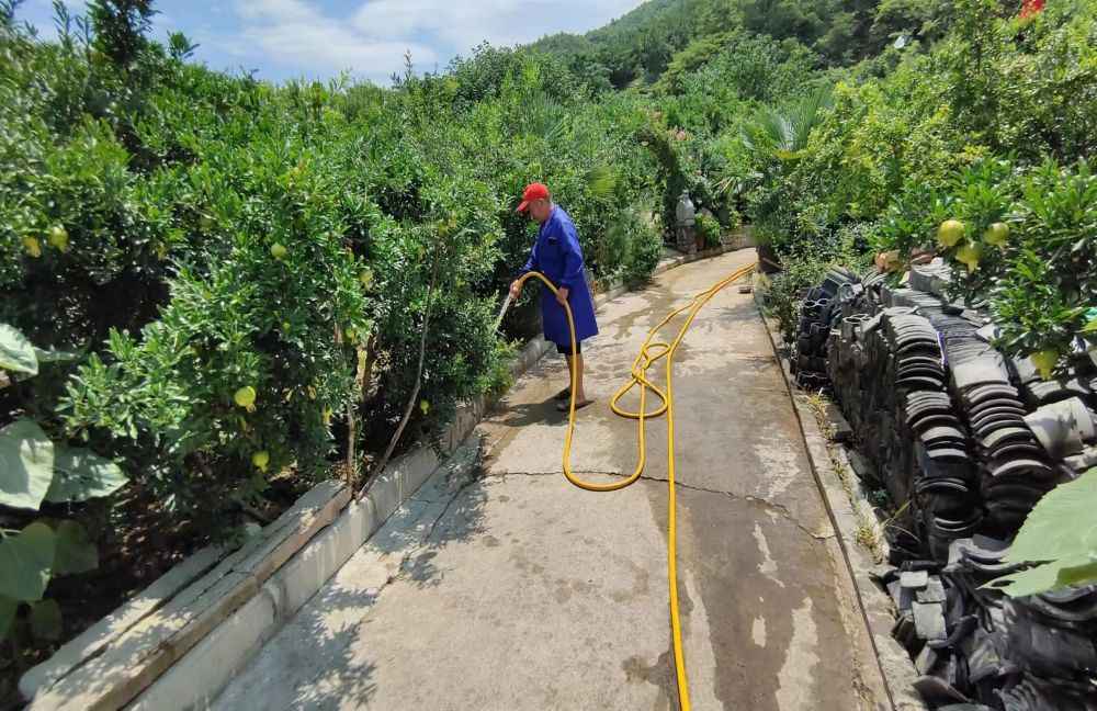 圖為石榴農(nóng)莊中的工作人員正在進行澆灌