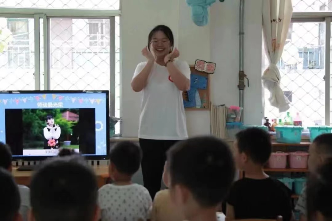 最后,實踐團成員鼓勵小朋友們積極思考并展開想象,從基礎動作入手,賦予它們以人物形象,與實際生活相結合。展現出一幅幅勞動者勞動畫面。隨后,進入手勢舞展示環節。小朋友們跟隨著音樂,在實踐團成員帶領下完成了手勢舞。
