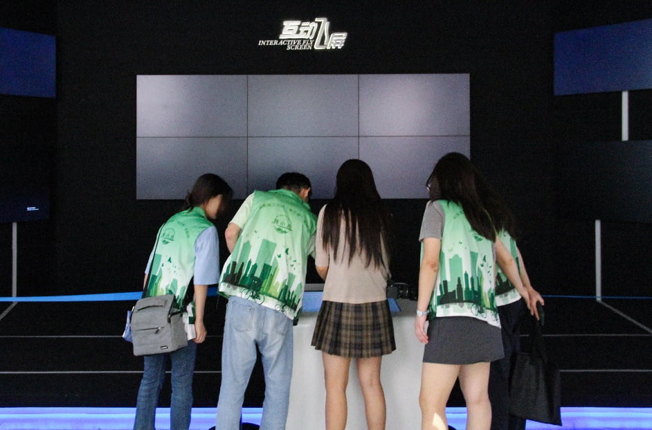 圖為林小青實(shí)踐團(tuán)成員體驗(yàn)互動(dòng)飛屏 岳慶雨 供圖