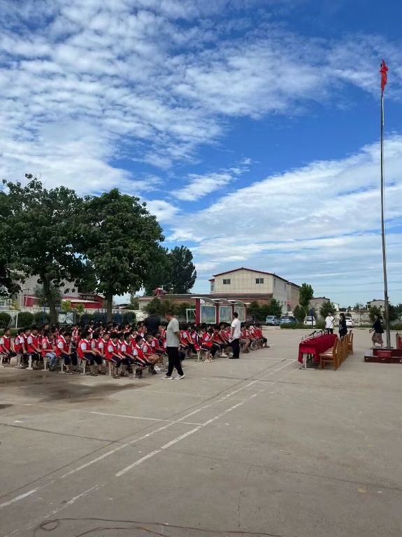 周一該成員乘車到達希望小學,小朋友們都搬著凳子坐在了校園廣場上,前面有一排領導的位置,參加此次會議的有帶隊的隊長,禹州市負責這項活動的負責人,還有本校的校領導。