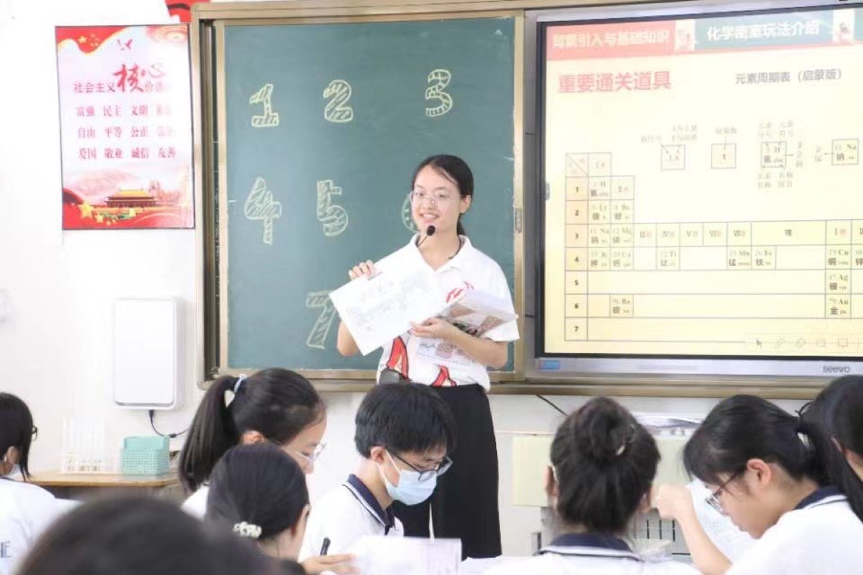 教育大國到教育強國的轉變,需要系統性的質變,需要不斷改革創新。華師化院團委服務隊致力于推廣錢揚義教授的“520化學桌游”,以新型游戲理念創新化學課程、普及科學知識,讓學生能夠在輕松有趣的氛圍下有效學習化學,在潛移默化中培養學生的化學學科核心素養。另一方面,創新化學科普課程既提升了化學教學質量水平,又提供了化學游戲的新型教學模式的思路。同時,華師化院團委服務隊不僅結合隊伍特色精心設計花燈,以飽含青春朝氣的理想信念獻禮華師九十周年校慶,還在課程中融合朋輩引導教育,讓學生在人生道路的起步階段,尋找方向所在,堅定未來理想信念,擘畫人生藍圖,激勵學生不斷提升思想素養、身體素質、精神品格和綜合能力,在國家和民族的歷史進程中留下非凡英姿。