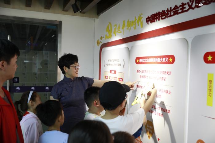 在志愿者的帶領下,小學生們走進了我校新時代學習館。志愿者寧鄭洋結合少年兒童特點,以“童言童語”的形式,從黨的二十大主題、黨的二十大報告思維導圖以及黨的二十大對未來作出的戰略部署進行講解,增強少年兒童對黨的政治認同、情感認同和實踐認同。