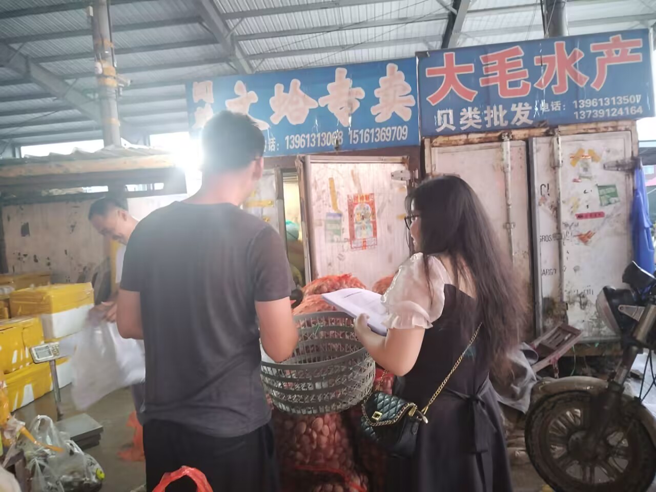 為了深切感受電商發展給海頭鎮帶來的變化,了解商販們進貨和發貨的流程,并詢問他們的工作經歷和感受,7月12日,江蘇科技大學海頭電商直播調研團來到蘇魯海產品綜合批發市場,展開了對商販們的調查。