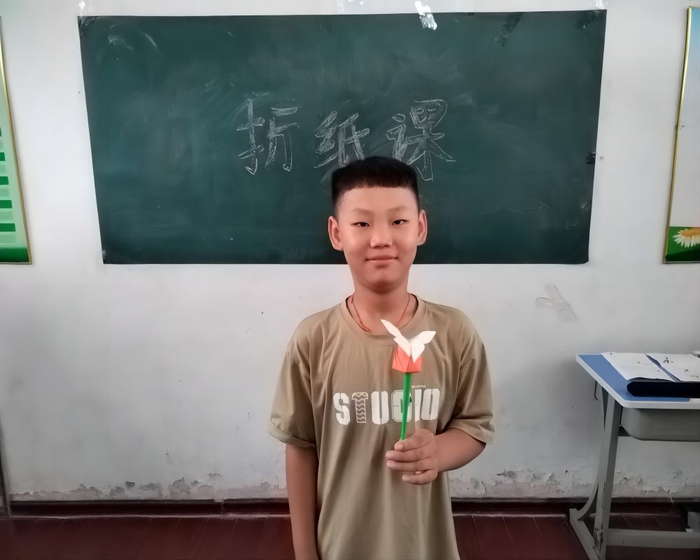 隨后,實踐團成員決定教授學生們玫瑰花的折疊,雖然相較于飛機的折疊,玫瑰花的折疊難度較大,但是學生們對此依舊十分感興趣,隨著折紙步驟逐漸趨于復雜,很多孩子萌生了放棄的想法,實踐團成員耐心地為他們解釋每一步的折法。最后,在實踐團成員的細心教導和孩子們的不懈努力下,孩子們完成了許多漂亮的折紙作品,孩子們露出了開心的笑臉,相信在孩子們每一個笑臉的背后是又一次收獲了一份美好的回憶。