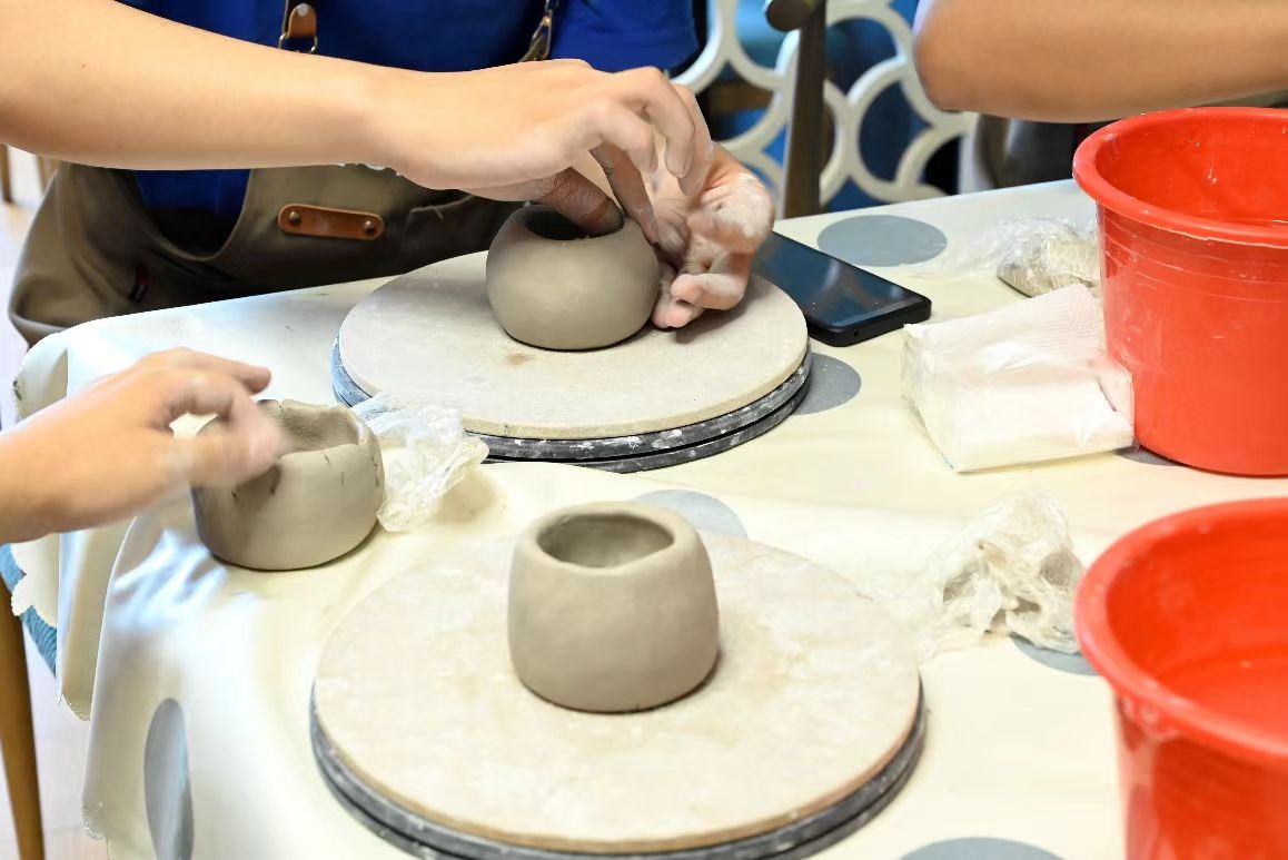 而后,在店員的帶領(lǐng)下,團(tuán)隊(duì)成員開始嘗試陶藝作品的手工制作。從揉泥、制坯、拉坯、修坯,到最后的造型、上色,在每一個(gè)環(huán)節(jié)中,實(shí)踐團(tuán)成員都能體會(huì)到陶藝的美麗和魅力。從最初的不成形的一塊泥巴,到經(jīng)過一道道工序、蛻變?yōu)橐患?dú)一無二的陶藝作品,這其中不僅充斥著手工藝者的巧思,更蘊(yùn)含著中華傳統(tǒng)文化的魅力。
