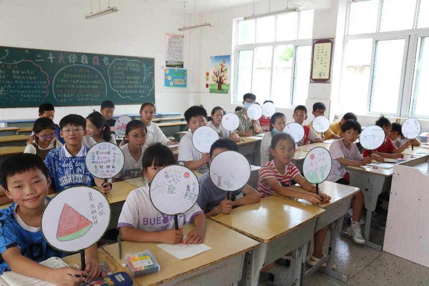 本次支教活動一共有五個班級,分別從二年級到六年級,平均每個班有35名學生。上午八點半,第一堂課準時開始,孩子們都按時到達教室,坐在自己的位置上準備上課。五年級的第一課是陳雨涵同學帶來的傳統文化,她利用大量精美的圖片介紹了中國的傳統刺繡文化。張瑩同學在六年級開展的第一課是傳統服飾,她結合圖片和視頻向孩子們展示了不同時代的服飾特點和相關文化背景。本次支教特色課程——主題團課由隊長韓明慧在三年級講授,她通過介紹“什么是共青團”引入課堂,講述了共青團的歷史、基本組織構架和奮斗目標,隨后,韓明慧同學闡釋了共青團和少年先鋒隊的關系,呼吁同學們好好學習,培養能力,愛祖國、愛人民,努力成長為社會主義現代化建設需要的人才。其他年級也進行了美術、手工等課程的教學,讓小朋友們學習豐富多彩的課程內容。